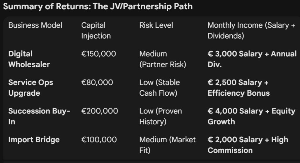 With a capital range of €50,000 to €300,000, you have two distinct strategic paths. You can be the Captain of a Speedboat (Starting Solo) or the Co-Pilot of a Cargo Ship (Joint Venture).