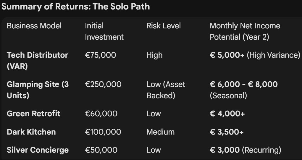 • Examples: Developing luxury eco-tourism sites (Glamping) on rural land, launching a specialized “Green Retrofit” service to tap into EU sustainability grants, or running high-volume Dark Kitchens optimized for delivery apps.